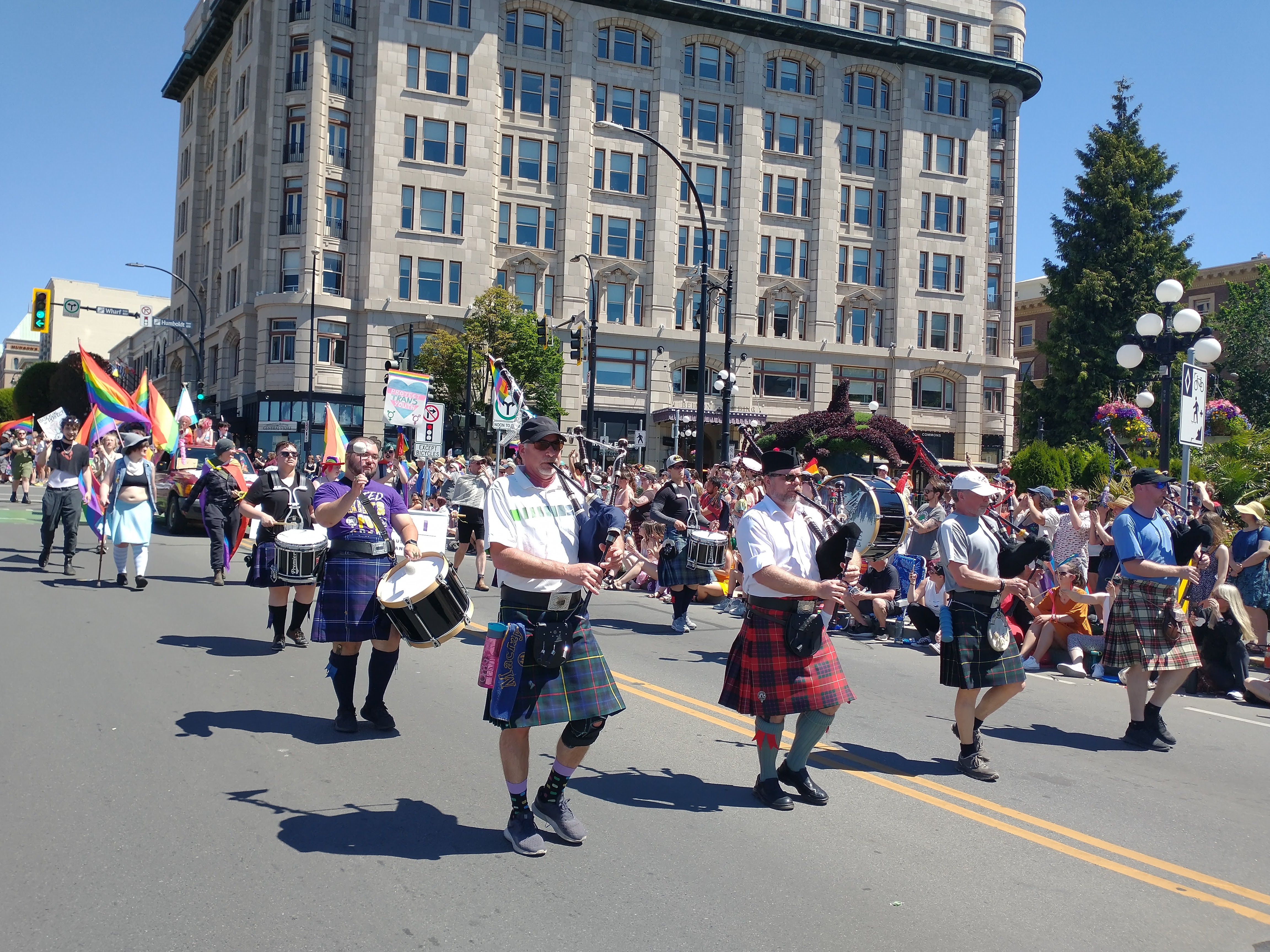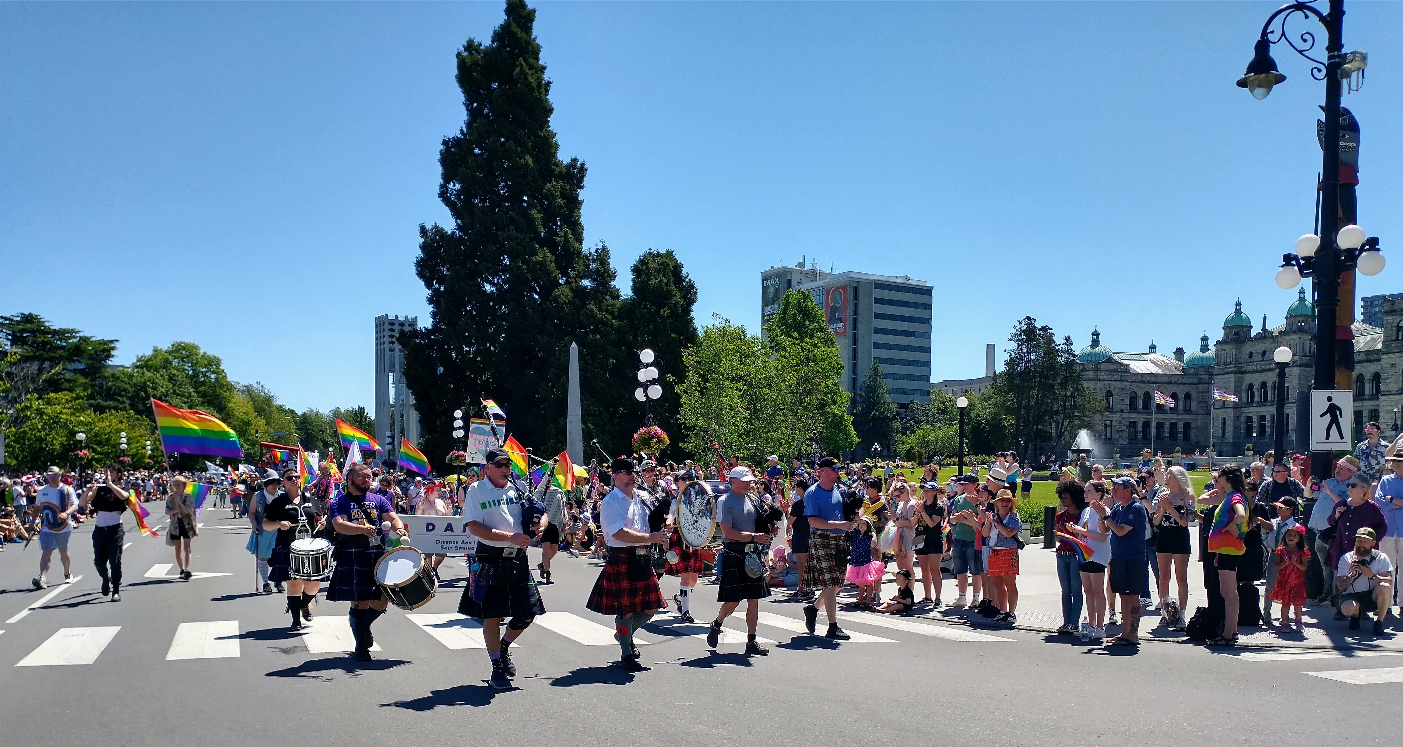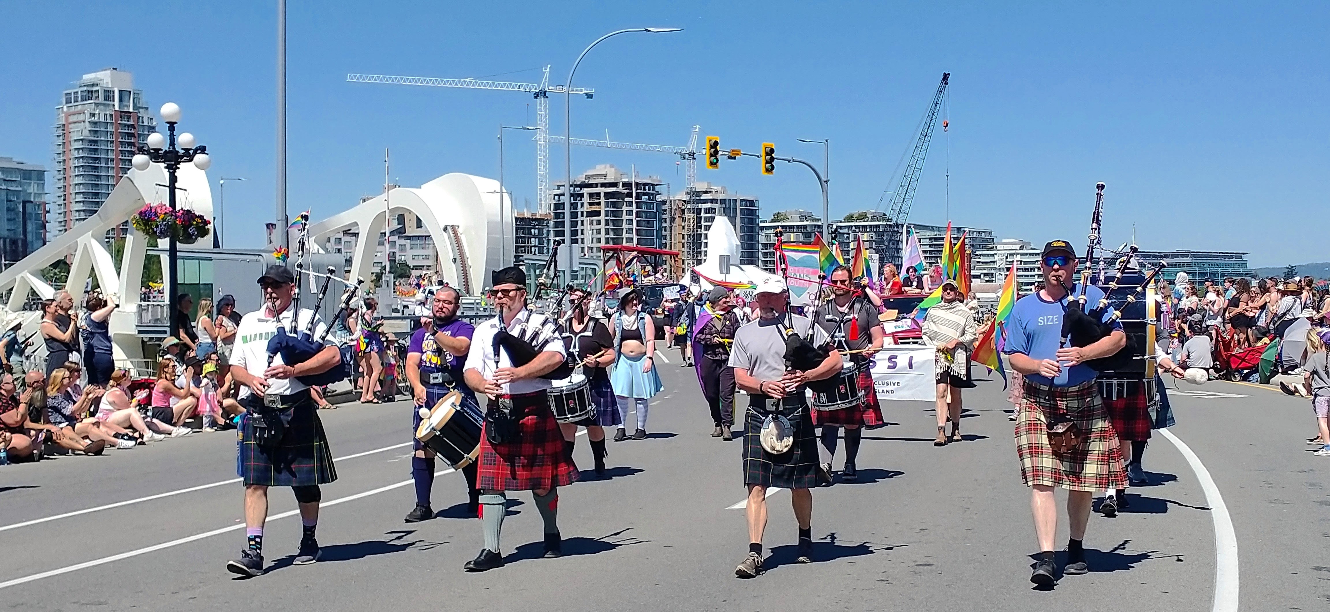 The Victoria pride parade is a celebration and recognition of LGBTQ+ folks and their fight for equality. CCPD happily joined the celebration in informal dress, allowing personal kilts and light clothing to combat Victoria's hot June weather!
