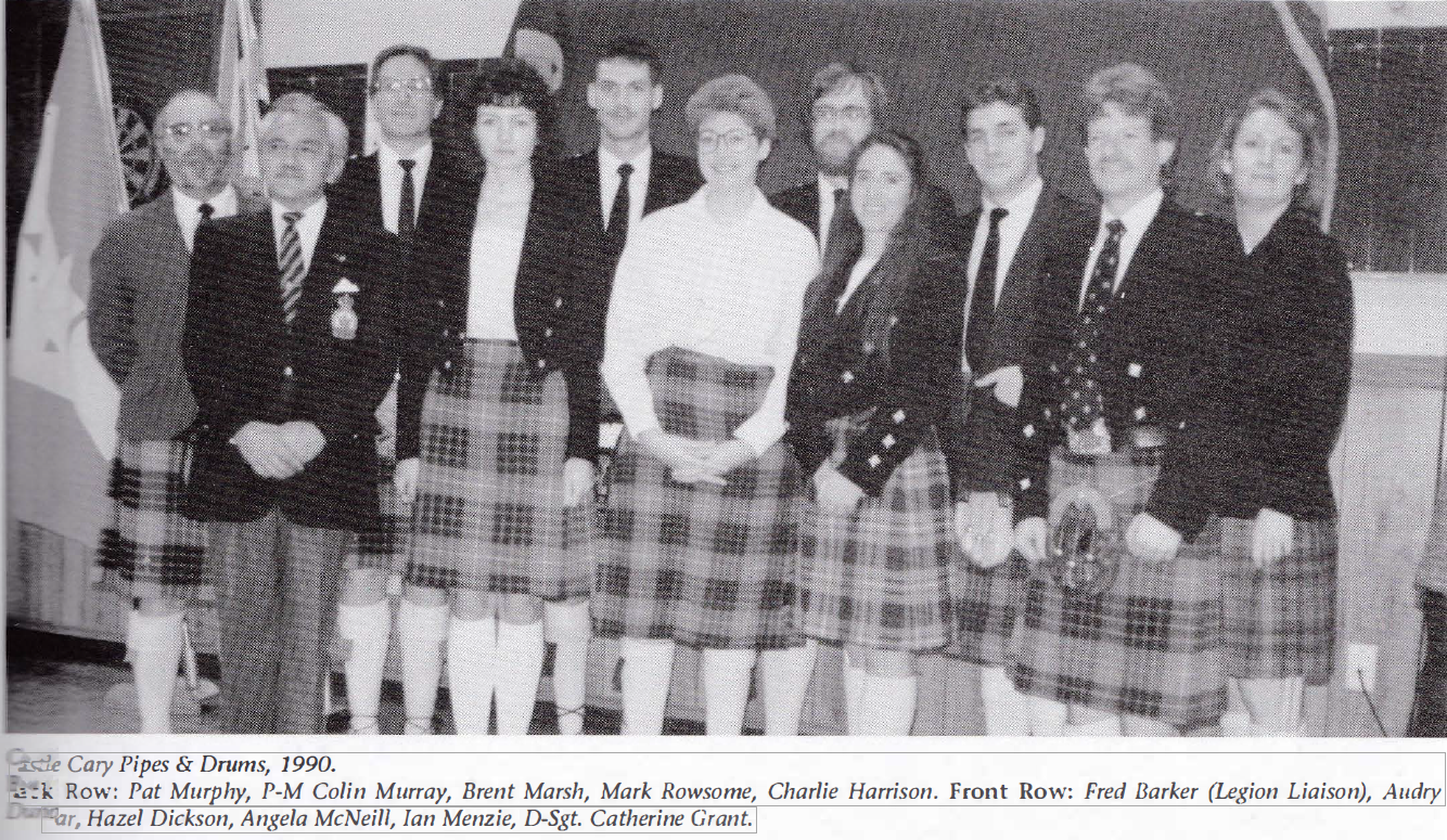 Castle Cary Pipes and Drums was formed in 1988 by Ian Menzies, Pipe Major and Tom Ferguson, Lead Side Drummer. It started under the name Pig & Whistle Pipe Band after the sponsoring restaurant. Chief instructor Bob Quigg provided instruction to students wanting to join the Band and Catherine Grant joined as Lead Drummer. Colin Murray from the Red Hackle and Clan Campbell bands in Scotland provided the musical direction, making the settings and selecting the music. In 1989 the Pig & Whistle Restaurant closed and the members adopted the name of "The Castle Cary Pipes and Drums". Castle Cary was a castle like structure built by B.C.'s first Attorney General - George Hunter Cary - a controversial, rambunctious figure.